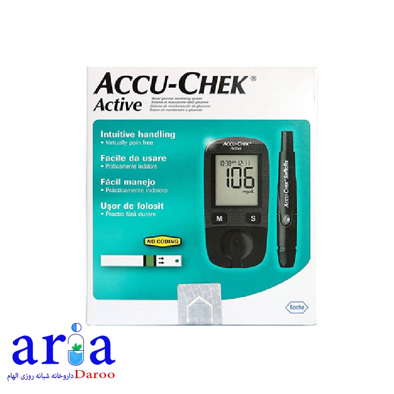 دستگاه تست قند خون «Accu-Chek» مدل «Active» ساخت شرکت مشهور «Roche» است که در زمینه‌ی تولید دارو و ابزارهای تشخیصی در جهان شناخته شده است. این دستگاه علاوه بر دقت بالا مزیت‌هایی که دارد که آن را به یک دستگاه حرفه ای برای استفاده ی آسان توسط همه تبدیل کرده است. قبل از اندازه‌گیری قند خون، شخص می‌تواند مشخص کند که این تست را قبل از خوردن غذا انجام می‌دهد و یا پس از آن. نتیجه‌ی اندازه‌گیری شده با این مشخصه داخل حافظه‌ی دستگاه ذخیره می‌شود و تفاوت قند خون در حالت‌ها و ساعت‌های مختلف قابل‌مقایسه است. حافظه‌ی دستگاه قابلیت ذخیره‌سازی 500 نتیجه را دارد. علاوه بر این قابلیت میانگین‌گیری در دوره‌های زمانی 7، 14، 30 و 90 روز نیز در این دستگاه گنجانده شده است. دستگاه برای اندازه‌گیری دقیق قند خون تنها به 0.6 میکرولیتر خون نیاز دارد. به‌وسیله‌ی قلم سوزن زنی و سوزن استریل می‌توان نوک یکی از انگشتان را سوراخ کرده و یک قطره خون روی نوار تست قرار داد. تنها 5 ثانیه طول می‌کشد تا نتیجه‌ی تست روی صفحه به ‌نمایش درآید. مزیت ویژه این دستگاه این است که اگر مقدار خونی که روی نوار قرار می‌گیرد کافی نباشد، دستگاه هشدار می‌دهد و مانند بسیاری از دستگاه‌های قند خون نتیجه‌ی اشتباه را نشان نمی‌دهد. مزیت دیگر این دستگاه این است که می‌توان از نقاطی غیر از نوک انگشت نیز خون‌گیری کرد. برای این کار ابتدا باید نوار را داخل دستگاه گذاشت تا کد خوانی شود و سپس نوار را خارج کرده و یک قطره خون روی آن قرار داده و دوباره نوار را داخل دستگاه گذاشت. در این حالت نمایش نتیجه 8 ثانیه طول می‌کشد. چنانچه به مدت 30 تا 90 ثانیه از دستگاه استفاده نشود، به شکل خودکار خاموش می‌شود. اقلام همراه دستگاه شامل 10 نوار تست، سوزن زن، 10 عدد سوزن  و CD آموزشی فارسی است که داخل یک کیف پارچه‌ای نرم ارائه می‌شوند. سوزن‌زن یا اتو لانستی که داخل کیف وجود دارد، دارای قابلیت تعیین سرعت پرتاب و در نتیجه میزان خون‌گیری است. منبع انرژی دستگاه از یک عدد باتری سکه‌ای CR2032 تأمین می‌شود که تا 1000 بار جوابگوی استفاده از دستگاه است. از آنجایی که حافظه‌ی دستگاه محدود است، می‌توان اطلاعات ذخیره‌شده روی آن را توسط کابل Micro USB به کامپیوتر شخصی فرستاد. به طور خلاصه تست قند خون Accu-Chek Active دارای 500 حافظه‌ی ذخیره‌سازی، قابلیت میانگین‌گیری از نتایج، نمایش نتیجه در 5 ثانیه، قابلیت خون‌گیری از سایر قسمت‌های بدن، عدم نمایش نتیجه‌ی در صورت کافی نبودن خون و اقلام همراه کامل داخل یک کیف نگه‌داری بوده و برای اندازه‌گیری قند خون تنها به 0.6 میکرو لیتر خون نیاز دارد.