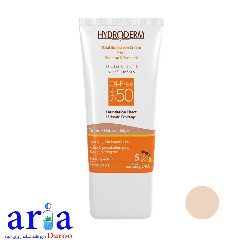 کرم ضدآفتاب SPF50 فاقد چربی با پوشش کرم پودری بژ طبیعی هیدرودرم _HYDRODERM